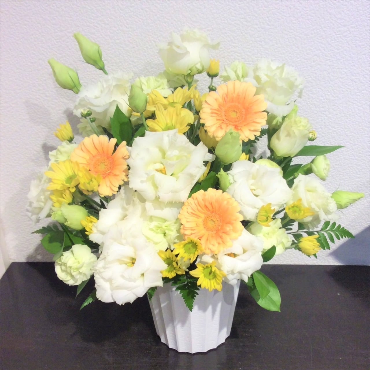 注意事項:使用する花材は当店のフローリストが厳選したものですが、季節や入荷状況により変更される場合がございます。アレンジメントは一点ものですので、デザインのリクエストにはお応えできません。お花に関するご要望がある際は、備考欄へご記入ください。