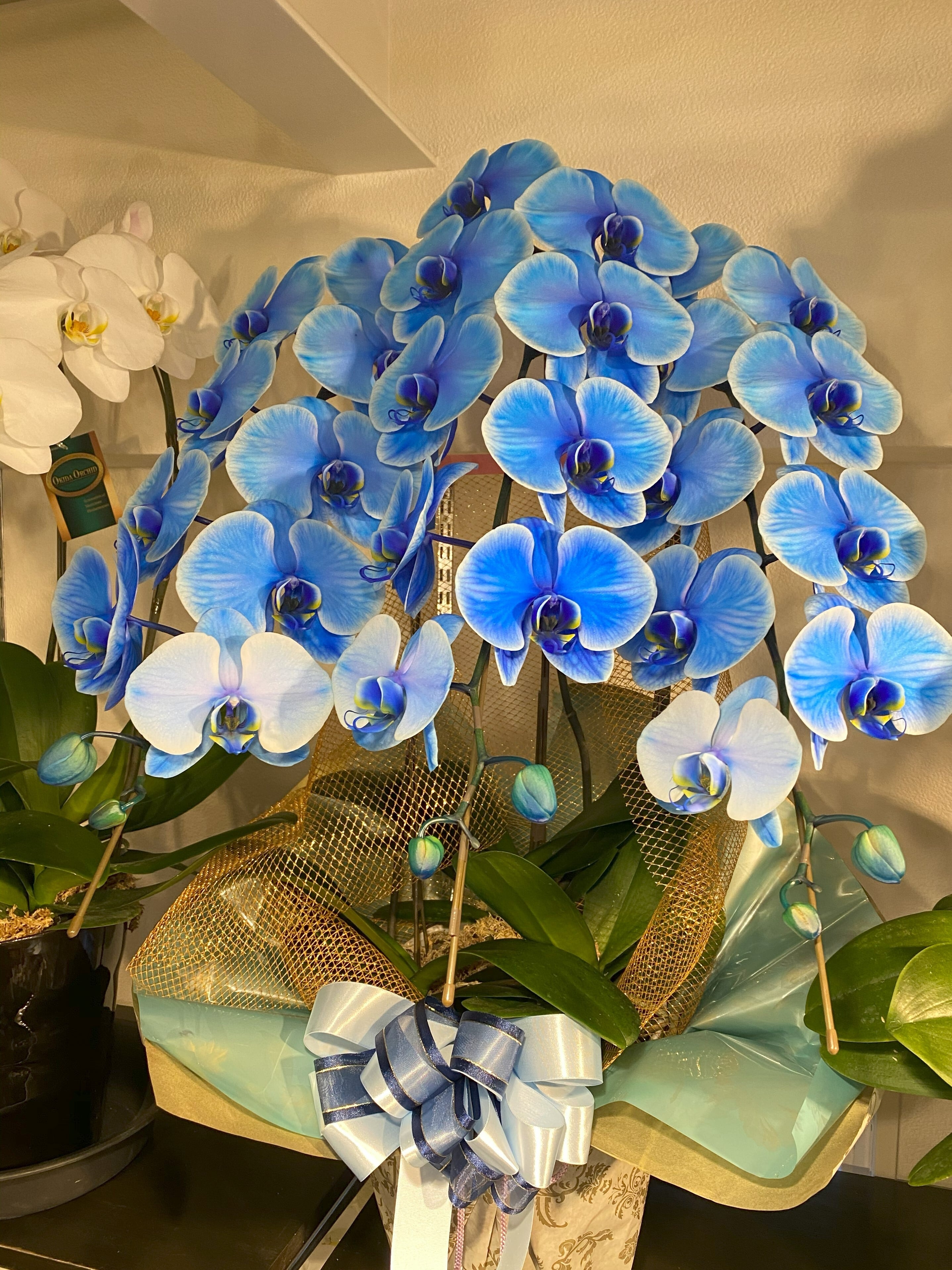 胡蝶蘭の花言葉である「幸せを運んでくる」から幸せを運ぶブルー色の胡蝶蘭はお店の開店祝や長寿のお祝い事におすすめ。