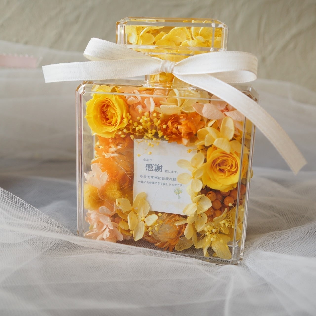 perfume bottle風の器に、明るい色合いの感謝の色の花(黄色オレンジ)と、可愛らしいピンクカラーの誕生日・色に意味合いを持たせた長寿祝にプリザーブドフラワーをあしらったアレンジは、永く飾れる心のこもった贈り物として最適でも喜ばれること間違いなしです!