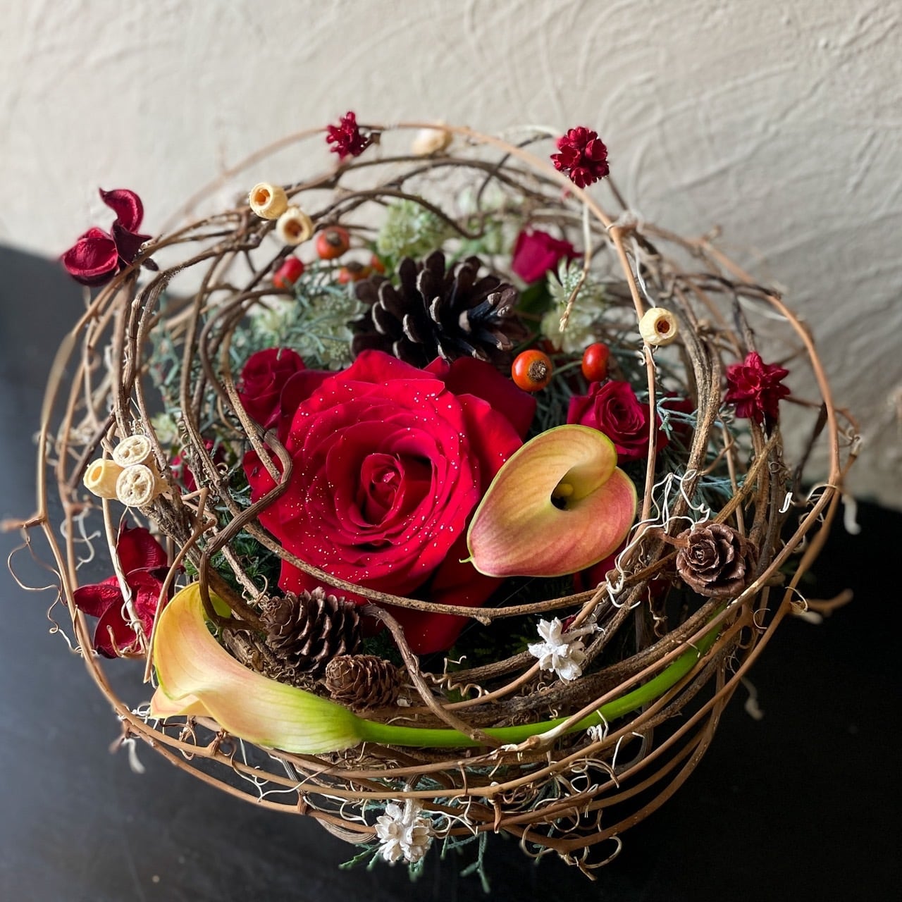 多様なグリーンを取り入れ、心温まるクリスマスの雰囲気を演出します。