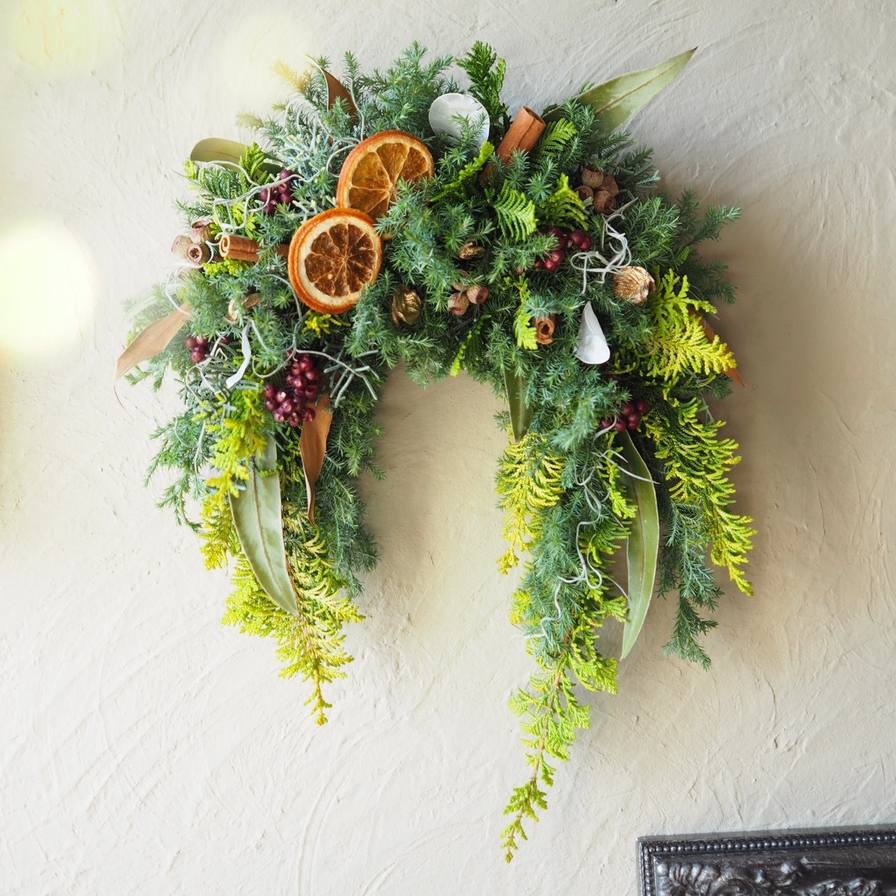 年末にぴったりのアイテムで、クリスマスや新年の祝いを感じさせる贈り物としても喜ばれる一品です。また、ご自身へのご褒美としても最適です。特別なシーズンを、このリースでより豊かに演出しましょう!