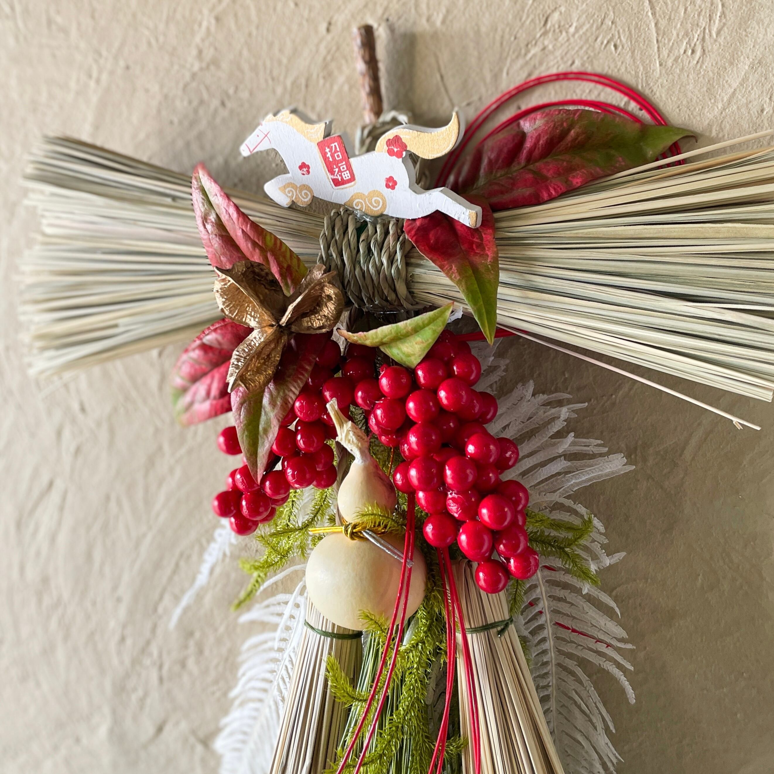 馬のように駆け巡る縁起の良い年を迎えることを願って午の干支をあしらったしめ縄です。