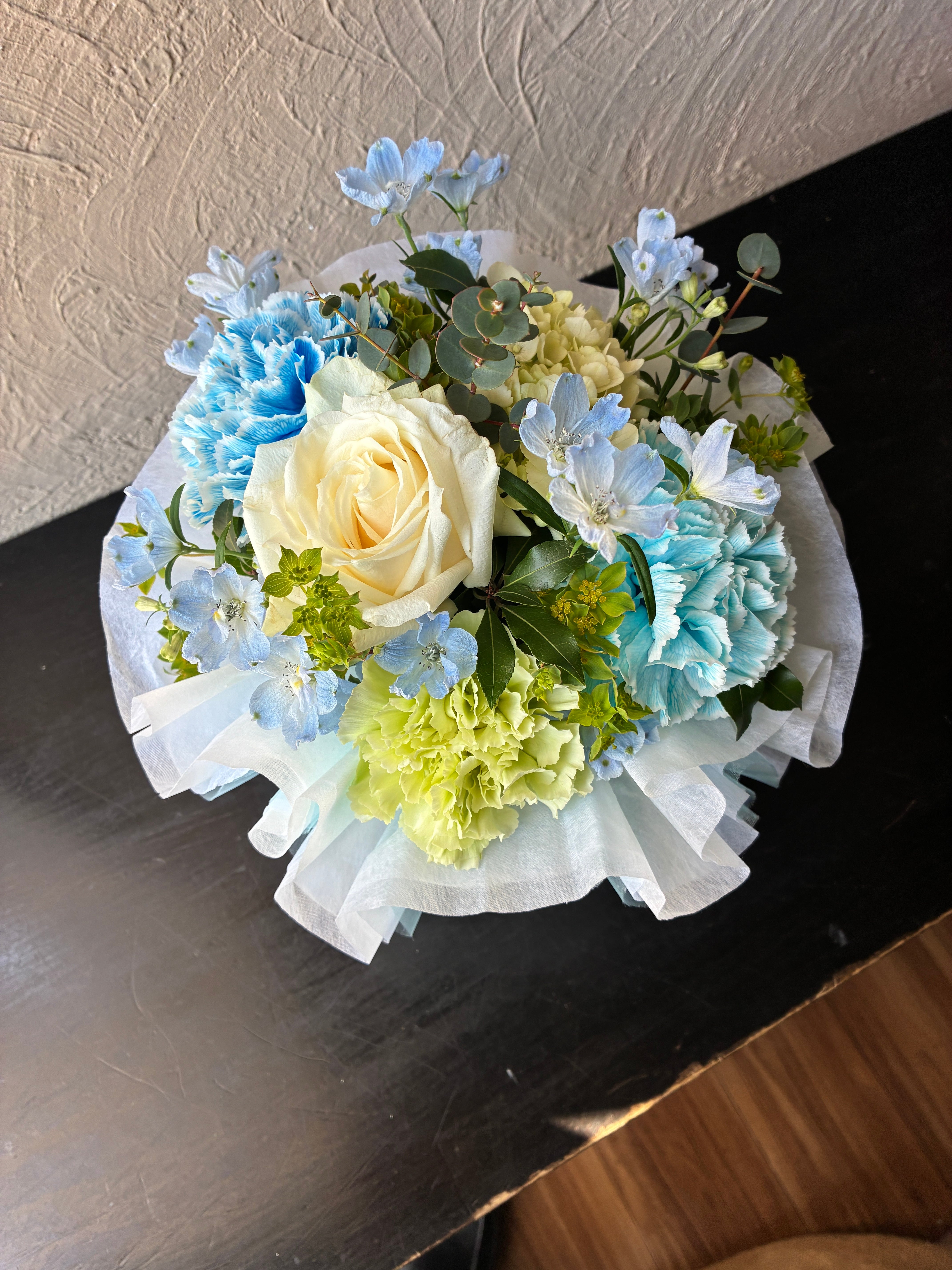 お花はコンパクトで、飾りやすい大きさ。全体的に丸くおしゃれな仕上がりのブーケです。