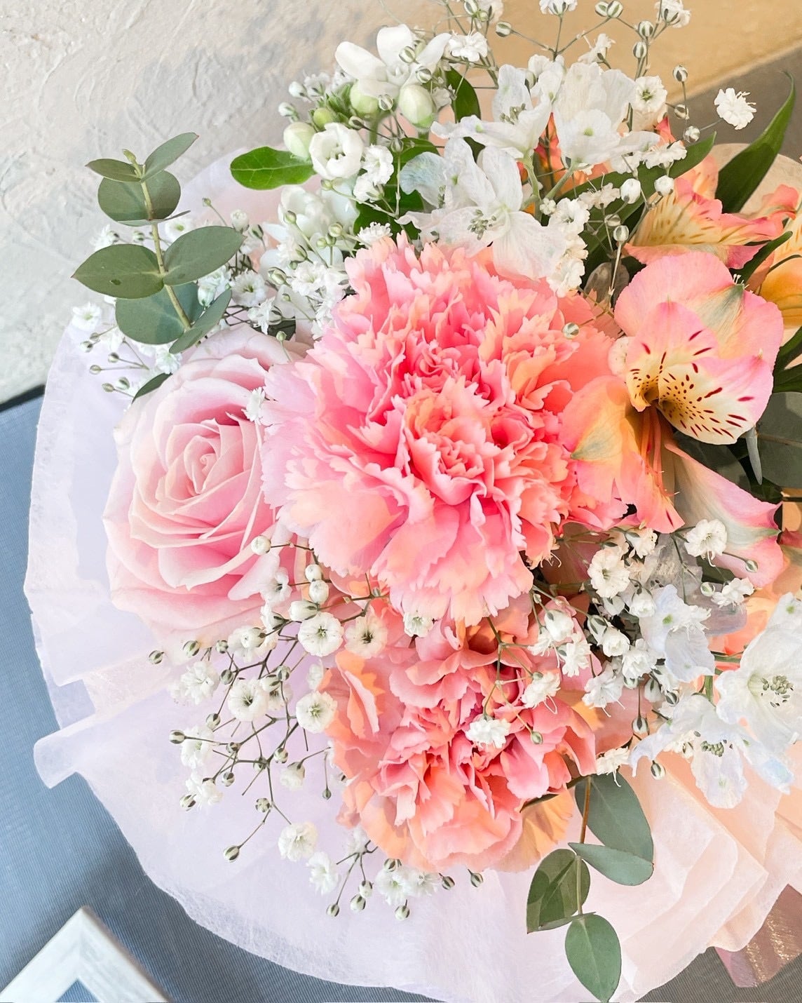 花束に使われているお花がどの方向からでも見えるオールラウンド形状。