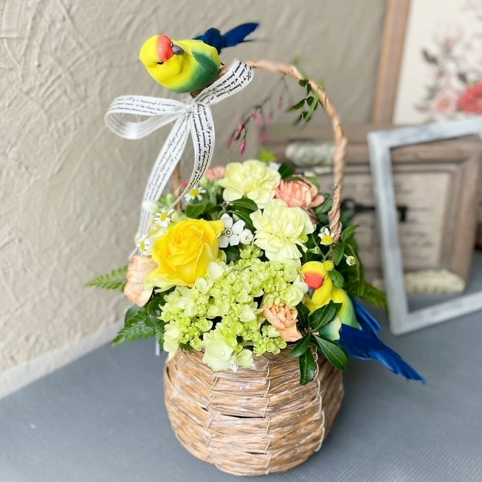 バスケットの手に小鳥とめて見た目も楽しめ、お花は新鮮で厳選したものを使用しています。母の日以外のご用途、贈り物にも最適です。