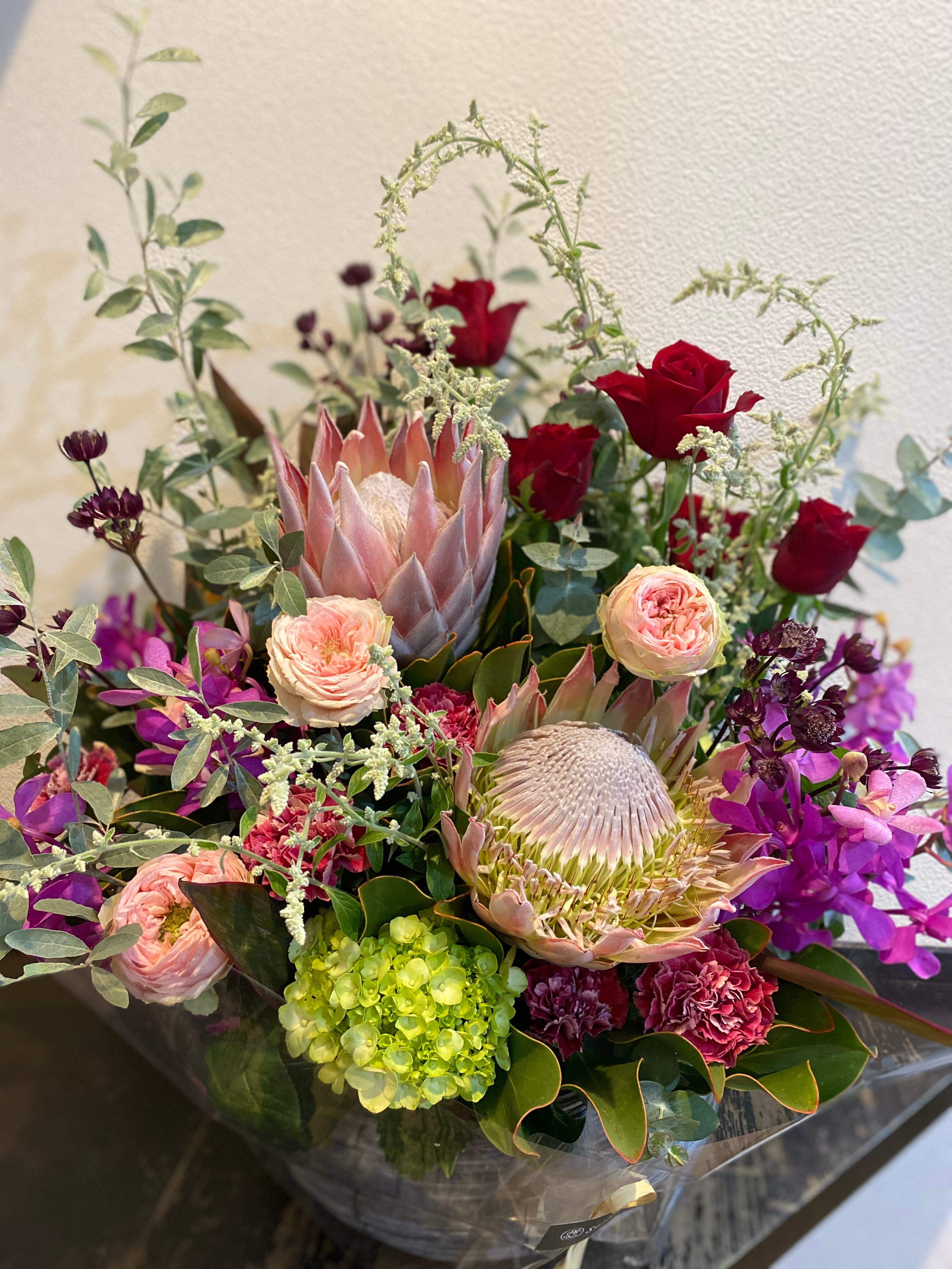 見た目が大きく、豪華で華やかなアレンジメント。【自社配達エリア限定品】